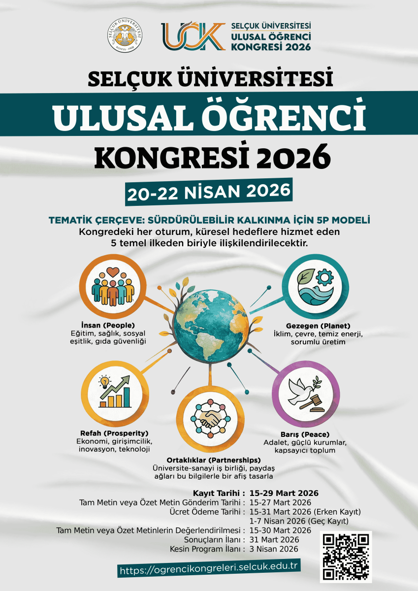 Selçuk Üniversitesi Araştırma Dekanlığı koordinasyonunda, 20-22 Nisan 2026 tarihlerinde Selçuk Üniversitesi Ulusal Öğrenci Kongresi 2026 düzenlenecektir. Detaylı bilgiye https://ogrencikongreleri.selcuk.edu.tr/ adresinden erişilebilir.
