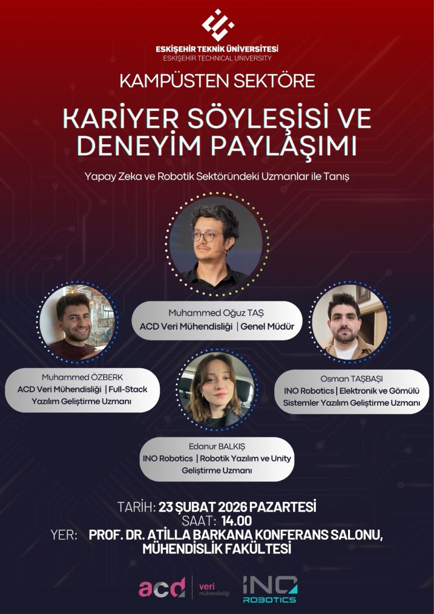 Etkinlik kapsamında ACD Veri Mühendisliği ve INO Robotics’te görev yapan uzmanlar; kariyer yolculuklarını, sektöre geçiş süreçlerini, teknik yetkinliklerin önemini ve güncel teknolojik gelişmeleri katılımcılarla paylaştı. Özellikle yapay zekâ ve robotik alanlarında ihtiyaç duyulan beceriler, proje geliştirme süreçleri, ekip çalışması kültürü ve sektörde karşılaşılan gerçek problemler üzerine yapılan paylaşımlar öğrenciler açısından yol gösterici oldu.
